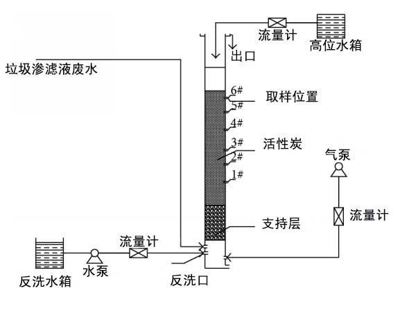 活性炭反應(yīng)器工藝流程圖如圖1所示;钚蕴砍赜捎袡C玻璃制成,有機玻璃是柱式反應(yīng)器;钚蕴砍馗叨葹2米。內(nèi)徑為63毫米。填充高度為1800毫米。碳層高度為1500毫米。砂濾器高度為300毫米。反應(yīng)體積為4.7 L.有5個水取樣口和碳池。底部有曝氣器,碳池頂部有溢流堰。水質(zhì)分析指標為紫外分光光度法和紫外分光光度計。