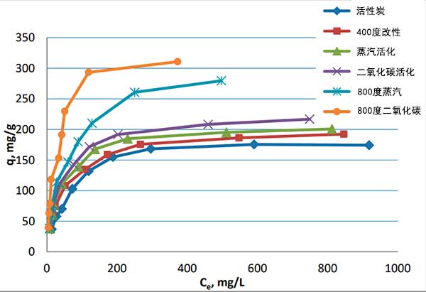 4.對(duì)于氯霉素,活性炭經(jīng)過(guò)一些列改性,具有更高的吸附能力。對(duì)于在800℃下在二氧化碳?xì)夥罩懈男缘幕钚蕴浚@得了較高的單層容量,并且?guī)缀跏俏锤男曰钚蕴康膬杀。?00℃下改性的活性炭的特征在于增加的比表面積,微孔體積和堿性的需氧基團(tuán)數(shù)量的增加。