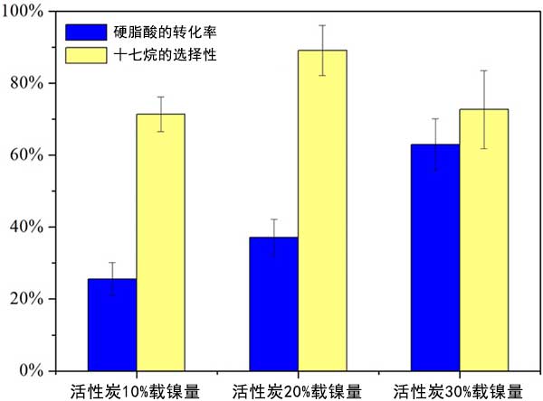 結(jié)果發(fā)現(xiàn)制備的活性炭載鎳催化劑并表現(xiàn)出優(yōu)異的脫羧活性和維持。硬脂酸可在370℃下完全轉(zhuǎn)化5小時,對十七烷的選擇性約為80%。過量的鎳顆粒可能會阻塞一定量的活性炭孔隙并減少孔隙體積。隨著高鎳負(fù)載量或催化劑負(fù)載量,裂解產(chǎn)物增加。溫度顯著影響硬脂酸的轉(zhuǎn)化,但不影響選擇性。具有大碳數(shù)的脂肪酸在活性炭反應(yīng)體系中易于裂化。