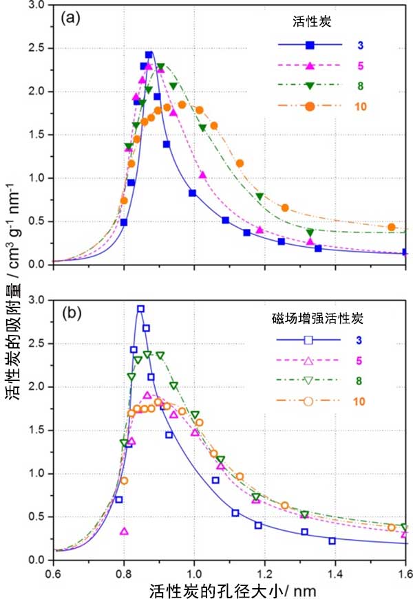 圖3:由(a)活性炭和(b)高磁場下制備活性炭的孔徑分布。