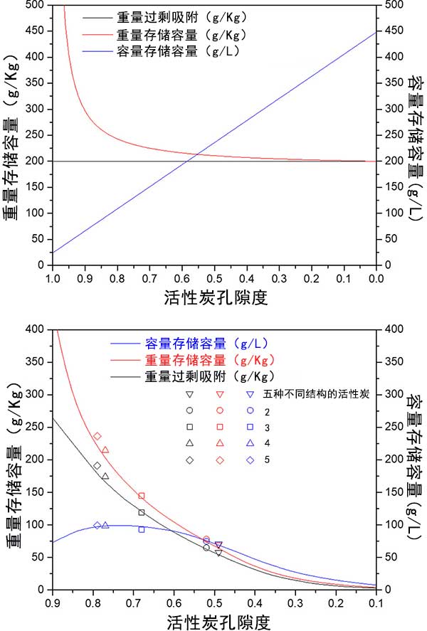 圖4顯示了兩種活性炭的重量和體積存儲(chǔ)容量之間的相互依賴性。實(shí)驗(yàn)吸附測(cè)量與第二模型一致,將孔隙率和表面積作為因變量處理。經(jīng)過(guò)對(duì)比活性炭樣品的實(shí)驗(yàn)性過(guò)量吸附,重量?jī)?chǔ)存容量和體積儲(chǔ)存容量。圖3和圖4將理論模型與實(shí)驗(yàn)數(shù)據(jù)進(jìn)行比較。它表明,所開(kāi)發(fā)的模型是通用的,并預(yù)測(cè)任何活性炭樣品的重量和體積儲(chǔ)存容量之間的相互依賴性。結(jié)果也適用于金屬有機(jī)骨架。雖然實(shí)驗(yàn)結(jié)果比較好的活性炭不具有較高的表面積,但孔隙率在0.65和0.75之間。通過(guò)使用化學(xué)粘合劑將活性炭粉末壓縮成整料,實(shí)現(xiàn)了更高的體積儲(chǔ)存容量。整體的體積儲(chǔ)存容量使用整體式整體密度而不是活性炭的表觀密度或金屬有機(jī)框架材料的單晶密度來(lái)計(jì)算。