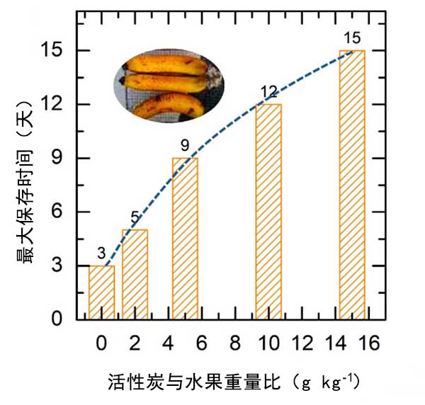 為了研究活性炭用量的影響,改變了活性炭和水果的質量比。圖4顯示了活性炭與水果的保存時間與質量比的范圍為。活性炭的量會影響保質期,并且可以看到非線性相關性(見圖4中的虛線)。沒有活性炭達到存在,水果儲存時間僅為3天。根據(jù)添加的活性炭的質量,保質期可以從2天延長至12天。通過添加15克吸附劑用于1千克水果,可以實現(xiàn)延長高達5倍的保質期。較高質量的活性炭提供較長的保存時間,這可能是由乙烯吸附的活性位點含量較高引起的。結果表明,氧化鈷浸漬的活性炭有望用于延長水果的保質期。