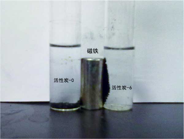 與不含鐵的活性炭相比,在四氧化三鐵存在下制備的磁性活性炭的矯頑力和剩磁有顯著影響。矯頑力和剩磁的低值接近于零表明活性炭在室溫下表現(xiàn)出超順磁性;钚蕴康某槾判袨槭蛊涓菀妆淮盆F或磁場(chǎng)分開。同時(shí),低剩磁在活性炭與原始解決方案分離后,大大減少了活性炭的聚集。使用磁鐵的簡(jiǎn)單分離試驗(yàn)的結(jié)果如圖4所示。