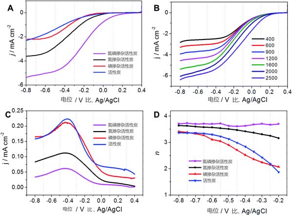 活性炭樣品通過兩步法制備,包括原位氧化聚合和高溫熱解。這里,苯胺和植酸分別用作氮源和磷源。為了研究氮磷碳比對活性炭的氧化還原電催化活性的影響,在中性介質(zhì)中進行循環(huán)伏安圖。旋轉(zhuǎn)圓盤電極伏安圖在氧飽和的50mM磷酸鹽緩沖溶液中進行,結果顯示在圖2A中。在摻雜碳改性后,活性炭基催化劑的起始電位顯示出從0V到+0.22V的大的正向偏移,氧化還原電流密度也大大增加。此外,由共摻雜碳改性的活性炭電催化活性優(yōu)于由單摻雜碳改性的活性炭電催化活性。在進行旋轉(zhuǎn)環(huán)盤電極測量以研究不同催化劑的過氧化氫的產(chǎn)生(圖2C)。正如預期的那樣,氮磷摻雜活性炭顯示出比其他催化劑更低的過氧化氫產(chǎn)生。可以看出,氮磷摻雜活性炭在氧化還原起始電位和高電流電流方面對氧化還原具有優(yōu)異的電催化活性,突出了N,P共摻雜和中孔結構對氧化還原的重要性。
