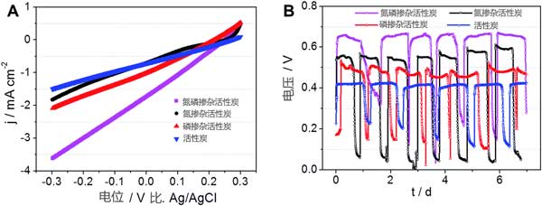 采用氮磷摻雜的改性方法改善活性炭的氧化還原電催化活性,制成的催化劑繼承了活性炭的大表面積和介孔特性,并且具有改善的石墨化程度,因此在起始電位和電流密度方面表現(xiàn)出更高的氧化還原電催化活性。在中性溶液中,與單摻雜碳改性的活性炭相比,與使用原始活性炭催化劑的燃料電池相比。使用氮磷摻雜的活性炭作為催化劑的燃料電池產(chǎn)生了高得多的開路電壓和兩倍的高功率密度,是可以實際應用的低成本且好用的氧化還原催化劑。