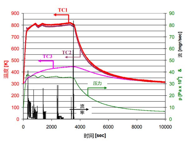 排出壓力約為3.5MPa的實(shí)驗(yàn)結(jié)果如圖4所示。250秒后,加熱功率為500W,中心溫度超過(guò)476℃,而電池底座溫度則為76℃。然而,將電池達(dá)到其穩(wěn)態(tài)溫度分布需要大約60分鐘,其中電池基座中的溫度為166℃。活性炭的溫度不允許超過(guò)526℃。 60分鐘,加熱功率逐漸降低,以保持最高溫度低于526℃,壓力高于3.5MPa。由于電池基座的溫升速率隨時(shí)間降低,輸送的氮量也減少了。因此,在15分鐘后結(jié)束放電階段僅從活性炭吸附池釋放4.6g氮。圖4中的冷卻階段持續(xù)約100分鐘,并且如果放電階段在15分鐘后結(jié)束(此時(shí)基礎(chǔ)溫度僅為126℃),則可以減少冷卻階段;钚蕴恐械募訜岷屠鋮s速率以及溫度分布與數(shù)值分析估計(jì)的相似。這表明簡(jiǎn)化的數(shù)值傳熱分析為吸附池中的傳熱提供了令人滿意的估計(jì)。