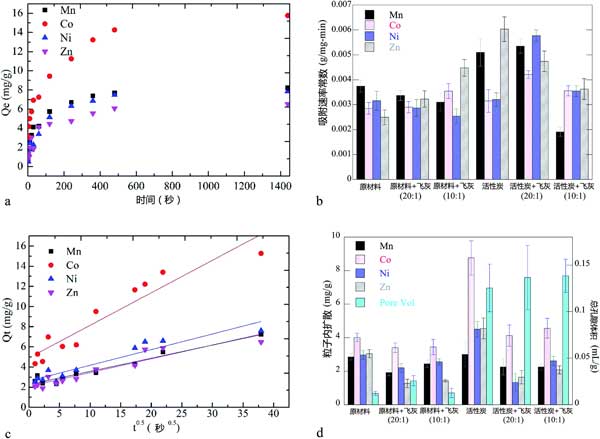 進行動力學和等溫線研究以測量這些活性炭用于從焦化廢水中吸附重金屬的可能性。動力學數(shù)據(jù)顯示快速初始攝取,然后漸近接近平衡,在24小時內(nèi)達到(圖3a中的示例動力學數(shù)據(jù))。應(yīng)用偽一階,偽二階和顆粒內(nèi)擴散模型以擬合動力學數(shù)據(jù)。在所研究的三種動力學模型中,偽二階模型最好地描述了具有顯著更高相關(guān)系數(shù)的實驗數(shù)據(jù)(所有重金屬/活性炭的R 2 > 0.98)比其他兩個型號高。圖3b顯示了吸附到每個焦炭樣品的每種金屬的假二級速率常數(shù)。