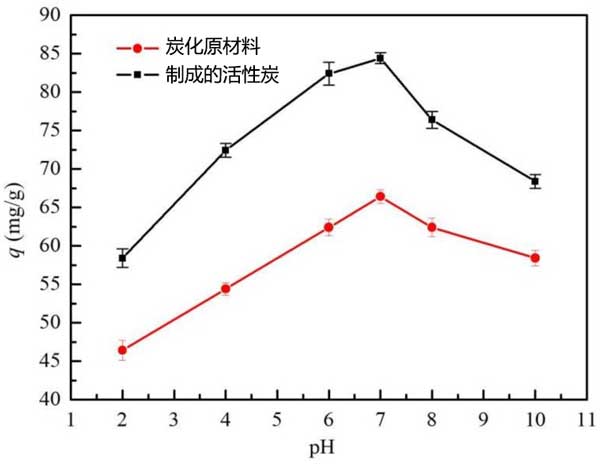 pH值的影響:吸附研究中最重要的因素之一是培養(yǎng)基pH的影響。根據(jù)吸附劑的用途,不同的物質(zhì)表現(xiàn)出不同的pH范圍。pH值對活性炭平衡吸附柴油的影響如圖3所示。當(dāng)吸附劑的pH值從2增加到10時,吸附劑用量,吸附劑溫度和接觸時間分別為0.2g,30℃和240秒。在酸性條件下,發(fā)現(xiàn)吸附容量隨pH增加而增加。當(dāng)pH為7時,吸附容量達(dá)到最大值。當(dāng)pH值繼續(xù)升高并且溶液系統(tǒng)變?yōu)閴A性時,吸附容量下降。這些結(jié)果表明,堿性和酸性環(huán)境不適合生物炭的吸附過程,活性炭吸附柴油的最佳pH值為7。這種變化可通過溶液中質(zhì)子數(shù)量的變化來解釋。和油乳液的穩(wěn)定性。強(qiáng)烈的酸性導(dǎo)致油脂聚結(jié),隨后增加油滴的大小。由于初始pH>7,由于酸性物質(zhì)的存在,柴油的溶解度增加,這使得柴油難以吸附在活性炭上。隨著初始pH的增加,過量的羥基離子和柴油競爭溶液中的活性吸附位點。