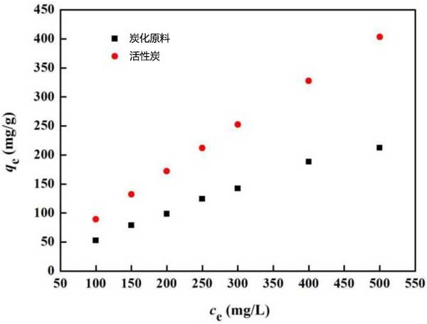 吸附等溫線:吸附等溫線對于描述溶質(zhì)如何與吸附劑相互作用非常重要,并且對于優(yōu)化吸附劑的使用至關(guān)重要。Langmuir等溫線假定單層吸附在含有均勻策略和吸附的有限數(shù)量的吸附位點的表面上,而在表面平面內(nèi)沒有吸附物的遷移。圖4顯示了柴油在所制備活性炭上的平衡吸附等溫線。從圖中可以看出,與炭化原料相比,活性炭的吸附等溫線更接近直線。隨著柴油溶液濃度的增加,活性炭對柴油溶液的吸附能力不斷增加。當(dāng)柴油濃度為500 mg/L時,活性炭達(dá)到最大吸附量。然而,當(dāng)柴油溶液濃度達(dá)到400 mg/L時,炭化原料的吸附容量增加緩慢?赡苁遣裼皖w粒覆蓋了材料的表面,導(dǎo)致吸附速率降低。從圖4中可以清楚地看出,活性炭的吸附能力明顯強(qiáng)于炭化原料。