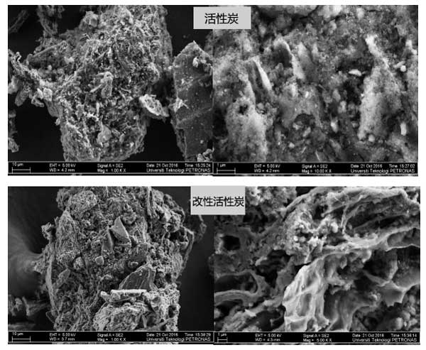 原始和改性活性炭的形態(tài)行為總結(jié)在圖2中。兩種不同的放大倍數(shù)(10μm和1μm)用于檢測官能化前后的表面形態(tài)。很明顯,活性炭在官能化之前由不規(guī)則的異質(zhì)表面組成。在用離子液體進(jìn)行表面改性后,沒有觀察到對(duì)結(jié)構(gòu)的明顯損壞。表面粗糙度從離子液體處理逐漸得到改善,離子液體處理與引入含氧官能團(tuán)有關(guān)。此外,通過在官能化后在結(jié)構(gòu)中引入小的和更大的孔,已經(jīng)批準(zhǔn)了活性炭的無定形性質(zhì)。據(jù)信這些微球是高比表面積和總孔體積的原因。改性活性炭在其結(jié)構(gòu)中顯示出更多的孔隙,這意味著除了制備方法之外,活性炭的形態(tài)很大程度上取決于所用的氧化劑。