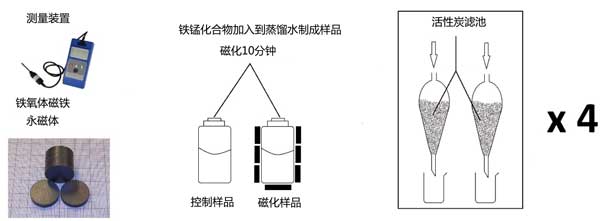 該實(shí)驗(yàn)在實(shí)驗(yàn)室規(guī)模上進(jìn)行,其中研究由八個(gè)分離漏斗組成。將各個(gè)分離漏斗成對分組并填充相同量的活性炭和其它吸附劑的過濾床。在每對分離漏斗中,一個(gè)用于對照樣品(不含磁性),而另一個(gè)用于磁化樣品。對照和磁化樣品分離漏斗中各個(gè)過濾材料的重量一樣。將鐵錳化合物加入到蒸餾水濃縮制備實(shí)驗(yàn)用的水溶液。對于磁化過程,使用永磁鐵氧體磁鐵進(jìn)行磁化。然后通過填充有活性炭和其它吸附劑的沉積物過濾溶液。未校正樣品的pH。pH的差異與添加單獨(dú)的金屬標(biāo)準(zhǔn)溶液有關(guān)。圖1顯示了制備用于過濾和過濾過程的模型水樣品的過程。