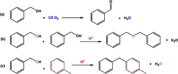 圖1所示,對(duì)于我們的銠活性炭催化劑,如果在布朗斯臺(tái)德酸中心存在下,芐醇氧化成苯甲醛可能發(fā)生平行反應(yīng):(a)苯甲醇氧化成苯甲醛(不需要酸中心)和副產(chǎn)物形成水。(b)兩分子芐醇縮合形成一分子二芐基醚,并除去水分子。(c)芐基化反應(yīng),包括從芐醇向甲苯分子中加入芐基碳陽(yáng)離子(未顯示),并除去水分子以形成甲基-二苯基甲烷異構(gòu)體等。