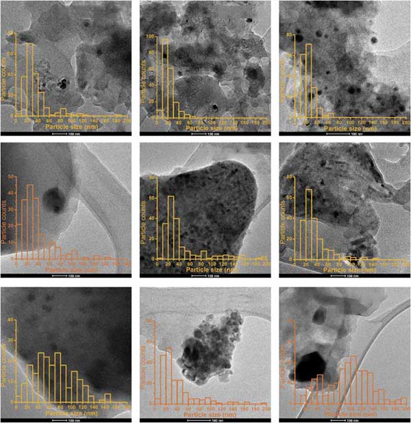 粒徑的變化在許多催化應(yīng)用中是至關(guān)重要的,并且使用硝酸的原理正是為了誘導(dǎo)這些變化。為了通過(guò)實(shí)驗(yàn)驗(yàn)證該假設(shè),對(duì)于所有九種載銠活性炭催化劑,通過(guò)TEM系統(tǒng)地評(píng)估Rh納米顆粒的粒度和分布。