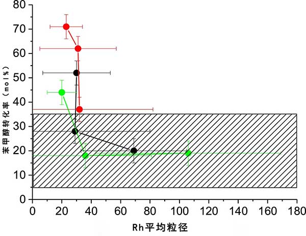 很明顯,這些粒徑范圍非常寬,我們認(rèn)為考慮這樣的大顆粒對(duì)氧化反應(yīng)具有活性是不現(xiàn)實(shí)的。在其它術(shù)語(yǔ)中,因子或參數(shù)是該預(yù)治療效果有在銠粒子的大小,但另外一個(gè)因素或參數(shù)是在銠粒徑變動(dòng)的影響對(duì)催化活性。圖3值得注意的是,對(duì)于高于約的顆粒。30-40nm不再觀察到與催化轉(zhuǎn)化的變化或相關(guān)性,表明粒度不再是活性參數(shù)。我們認(rèn)為該值是銠對(duì)芐醇氧化的活性的近似上限直徑,或者反過(guò)來(lái)對(duì)該反應(yīng)有活性要求小于約30納米。我們認(rèn)為這個(gè)結(jié)論雖然是一個(gè)廣泛的估計(jì),但與未來(lái)基于這種金屬的催化劑開(kāi)發(fā)相關(guān)。