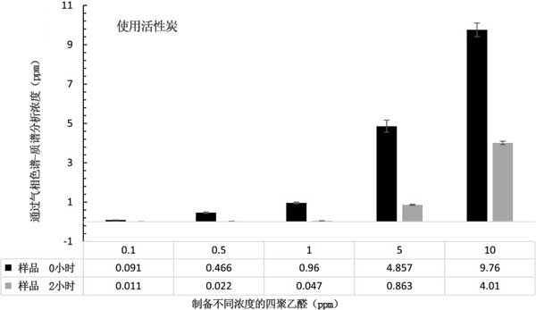 在活性炭去除四聚乙醛的作為聚乙醛增加的初始濃度降低中可以看出,對于0.1、0.5、1、5和10ppm,較低濃度的乙醛的去除率分別為88%,95%,95%,82%和59%。除去0.5ppm和1ppm時,乙醛的去除率略低于0.1ppm。這是因?yàn)榈蜐舛鹊奈奖砻鞔嬖诖罅康奈轿稽c(diǎn),但只有少量的吸附物,當(dāng)超過一定比例的吸附劑和吸附質(zhì)時,吸附減慢。因此,反應(yīng)較慢并且需要更多的吸附時間可以更有效地除去聚乙醛。