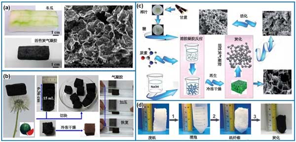 活性炭氣凝膠由納米結(jié)構(gòu)活性炭材料組成,其中孔隙充滿氣體。因?yàn)榭梢越Y(jié)合有益吸附性質(zhì)和高的熱穩(wěn)定性,并且擁有電子傳導(dǎo)性,和可成為催化劑載體,油或有機(jī)溶劑吸附和儲能方面的潛在應(yīng)用;钚蕴繗饽z還有一個特征是它們的超輕質(zhì)。除了高度多孔和輕質(zhì)之外,另一個優(yōu)點(diǎn)是在轉(zhuǎn)化成活性炭氣凝膠后引入導(dǎo)電性的可能性,因此允許在電化學(xué)區(qū)域(例如,電池,超級電容器或?qū)щ姶呋瘎┹d體)中的應(yīng)用。隨著新型活性炭材料的發(fā)展,已經(jīng)生產(chǎn)出具有超低密度和優(yōu)異導(dǎo)電性的石墨烯或基于納米碳管的活性炭氣凝膠作為新興的新型氣凝膠材料,這進(jìn)一步拓展了氣凝膠材料的應(yīng)用領(lǐng)域。除了高級碳材料能制造氣凝膠外,使用生物質(zhì)做成的活性炭氣凝膠如圖7所示。
