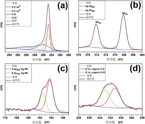 圖2顯示了所制備的活性炭樣品的組成元素的XPS光譜。XPS測量圖顯示碳,銀,硫和氧作為構成元素的存在。S 1p光譜配有多個高斯分量,這些物種通常存在于活性炭表面上。圖2(b)分別顯示了多個峰,它們與零價態(tài)的銀原子一致。S 2p光譜的高分辨率光譜的反卷積,如圖2(c)所示,顯示兩個自旋軌道分裂為〜1.2 eV的峰。O 1s光譜顯示出不對稱的曲線,表明活性炭表面存在多種氧物質(圖2d)。光譜的反卷積產(chǎn)生兩個,其可分別歸因于活性炭表面的C-O和C O物質,因此不存在金屬氧化物物質。總之,XPS結果表明硫醇鹽配體保持附著在銀簇表面的表面上,并且在活性炭樣品中不發(fā)生銀原子的氧化。