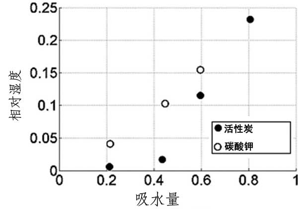 根據(jù)以前的測(cè)試結(jié)果,當(dāng)相對(duì)濕度在6至10%的范圍內(nèi)并且其在40%以上潮解時(shí),碳酸鉀在25℃開始水合。如圖2所示活性炭載體和吸附劑在40℃下的水吸附容量;钚蕴枯d體的吸收在相對(duì)濕度為60%下急劇增加,在相對(duì)濕度為80%下達(dá)到最大23%的重量增加。在那里,吸附劑的吸收量幾乎是載體的6倍,并且最重要的是,它遠(yuǎn)遠(yuǎn)高于理論上形成碳酸鉀倍半水合物所需的量。這種顯著差異的原因是鹽在約相對(duì)濕度為43%下潮解,因此所有過量的水在載體材料的孔中冷凝,產(chǎn)生鹽的水溶液。