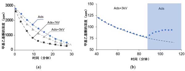 圖4:(a)在不存在和存在電場(chǎng)的情況下,甲基乙基酮的濃度。(b)在先打開(kāi)然后關(guān)閉電場(chǎng)的測(cè)試中,甲基乙基酮濃度。