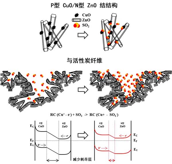 在圖3中,CuO顆粒隨機分散在ZnO花表面上。當CuO顆粒與ZnO花結合時,在p型CuO顆粒和n型ZnO花之間的界面處形成p/n結。在這種機制下,電子從n型ZnO轉移到p型CuO,并且空穴通過p型CuO到達n型ZnO,直到在系統(tǒng)中建立均勻的費米能級,從而導致能帶在耗盡層彎曲。然而,當CuO-ZnO組合結構暴露于SO 2時,電子通過Cu +之間的氣敏反應釋放和SO帶負電的2 -離子。還原的SO 2分子與CuO中的孔結合,從而減少了耗盡層和電阻。這種現(xiàn)象可通過降低電阻來實現(xiàn)良好的SO 2檢測。因此,p型CuO和n型ZnO的傳感響應的貢獻代表了傳感器的主要特性,而活性炭纖維的比表面積在SO 2傳感特性中起著重要的作用。