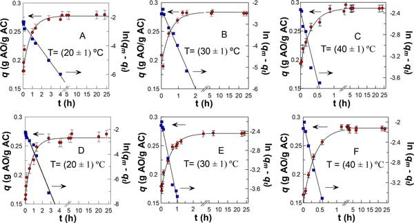 圖1顯示了典型的動力學圖,說明了沒食子酸和沒食子酸丙酯在平衡(q)時每質量活性炭吸附的抗氧化劑的量隨時間的變化。還顯示了在不同溫度下至少三個半衰期(相關系數(shù)>0.99)的相應一階圖。在所有情況下,吸附曲線均顯示在4h后達到平衡,并至少維持24h,這是后續(xù)研究的時間。