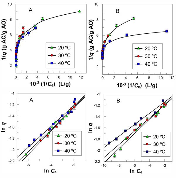 在不同的活性炭量下,評估了溫度(T=20–40°C)對沒食子酸和沒食子酸丙酯吸附過程的影響。實驗吸附平衡數(shù)據(jù)擬合到兩個等溫線模型,Langmuir和Freundlich方程,并評估了擬合優(yōu)度。圖2。在研究的交流范圍內獲得了非線性圖。因此,結果表明該模型不適用于描述沒食子酸和沒食子酸丙酯在活性炭上的吸附。注意,在任何給定的活性炭質量下,溫度的變化都會導致沒食子酸和沒食子酸丙酯的吸附能力發(fā)生非常小的變化,差異小于2%。