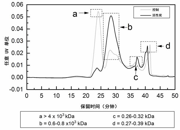 為了檢驗活性炭改變可溶性微生物組成,使其對膜具有更高的親和力這一假設,通過GPC分析了構成可溶性微生物的有機分子的大小分布(圖1)。在第二次可溶性微生物運行結束時收集了可溶性微生物樣品(圖1b),有趣的是,GPC色譜圖顯示了對照反應堆和活性炭加入反應堆之間的明顯差異。在活性炭反應器的可溶性微生物中,保留時間為24分鐘時,來自對照反應器的可溶性微生物的第一個峰顯著降低,而在活性炭反應器的可溶性微生物中,在28分鐘時觀察到峰的上升(圖1,分別是峰值a和b);钚蕴糠磻鞯目扇苄晕⑸镏械37分鐘處的峰也升高(峰c)?扇苄晕⑸镏心承┯袡C化合物含量的變化(升高或降低)可能歸因于,由于微生物群落組成的變化或某些活性炭所觀察到的代謝活性增強,導致某些微生物產(chǎn)品的產(chǎn)生和分泌增加另外,或抑制進水橄欖油廢水中物質的降解。有機化合物對活性炭顆粒的吸附只會降低其在可溶性微生物中的外觀。由于吸附到活性炭上,可溶性微生物中某些成分的減少(如峰a所示)也有可能優(yōu)先吸附其他成分,這些成分對通量的減少更不利,或者起膜調節(jié)前體的作用,這可能會增強生物膜的生長(例如峰b–d)。顯然,確定膜上有機污染物的身份是一項必不可少的任務,目前,尚不清楚不同可溶性微生物組分對膜污染的詳細影響以及它們被活性炭的吸附。