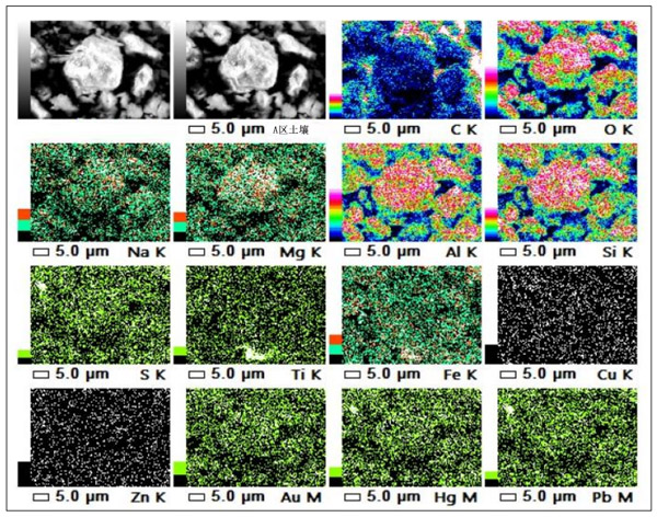 SEM-EDS測試使用了三個樣本,即A區(qū)域樣本,B區(qū)域樣本和原始土壤樣本。分析了這三個樣品。尋找的參數(shù)是充當污染物的重金屬元素。該測試的結(jié)果顯示了土壤中存在的元素的質(zhì)量百分比。掃描電鏡是一種用于表面觀察的工具,其焦點深度大于光學顯微鏡,可以直接觀察復雜的表面而無需復制。SEM圖像顯示出樣品的形態(tài)狀態(tài),顯示出大小不規(guī)則的團塊。同時,EDS分析非常適合揭示樣品中的化學元素和化合物。EDS的元素映射將為對象表面上的每個元素賦予不同的顏色,并定量分析每個元素的百分比。