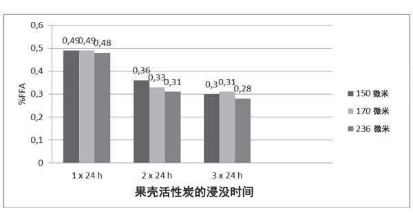 活性炭浸入進(jìn)行1、2或3天。從圖中可以看出,浸泡1天的FFA值在0.4-0.5%的范圍內(nèi)。浸泡兩天的FFA范圍不同(0.3-0.4%)。此外,浸泡3天的油中FFA很低,為0.2-0.3%。根據(jù)這項(xiàng)研究,發(fā)現(xiàn)活性炭可降低食用油的FFA。重要的是要強(qiáng)調(diào)指出,使用農(nóng)業(yè)廢料制成活性炭來處理水性廢水(主要作為替代性吸附材料)可能是一個(gè)優(yōu)勢(shì),因?yàn)樗鼈兛梢匀コ龔U水中的惰性污染物,并且可以很大程度地減少因不適當(dāng)處理這些廢水而造成的環(huán)境影響。