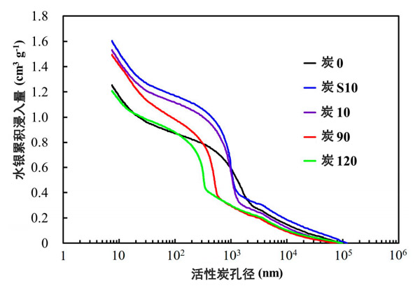 圖3:使用水銀壓入孔隙率法獲得的使用球磨活性炭的盤(pán)式EDLC電極的累積孔體積。