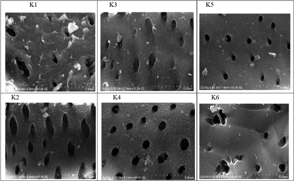對(duì)原始活性炭(圖3中的K1)的掃描顯示出相當(dāng)均勻的孔;钚蕴康慕Y(jié)構(gòu)可以看作是薄片,為不規(guī)則分布和各種尺寸的孔提供了較大的吸附面積。表面上的大多數(shù)可見孔都在5微米范圍內(nèi),這與對(duì)椰殼活性炭的預(yù)期一致,而在這5微米孔內(nèi)可以看到小于1微米的較小孔。圖3中的K2顯示了在氯酸鹽吸附到表面活性部位后活性炭表面的變化。這些孔有變化的跡象,因?yàn)槠渲幸恍┪铰人猁},而其他孔被氯酸鹽和氯化物分子阻塞。在10,000倍的放大倍率下,可以觀察到小孔周圍和大孔入口處的沉積,因?yàn)轭A(yù)計(jì)表面活性基團(tuán)會(huì)大量存在于這些區(qū)域。活性炭的酸性再生極有可能形成了表面活性部位,從而增強(qiáng)了活性炭吸附大量氯酸鹽的能力。