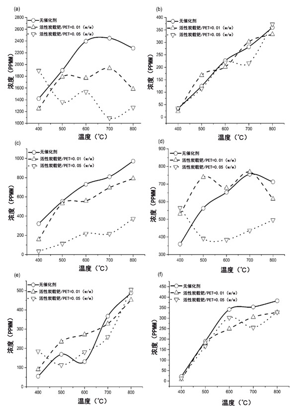 圖1:在有和沒(méi)有活性炭載鈀催化劑的條件下,聚對(duì)苯二甲酸乙二醇酯(PET)的熱解得到的聯(lián)苯衍生物濃度的類(lèi)型。(a)2-萘甲酸,(b)芴酮,(c)三亞苯基,(d)聯(lián)苯基-4-羧酸,(e) -三苯基和(f)鄰-三苯基。