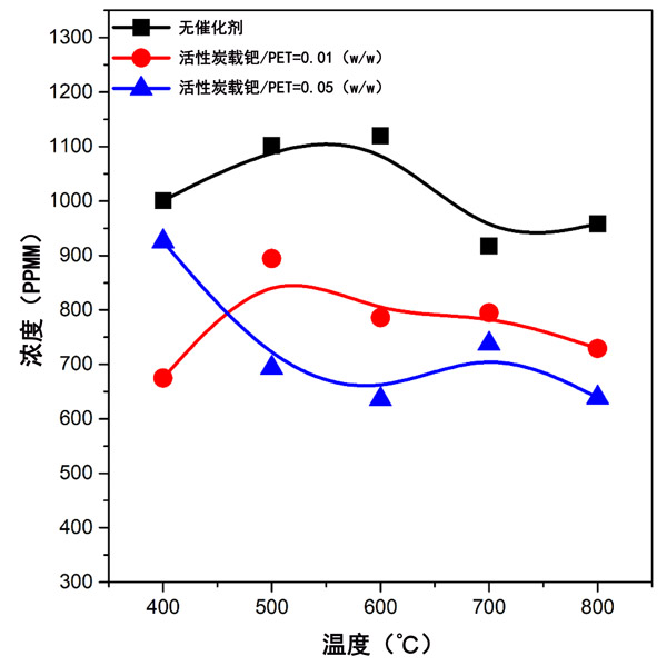 圖2:在有和沒(méi)有活性炭載鈀催化劑的條件下,聚對(duì)苯二甲酸乙二酯熱解過(guò)程中總胺衍生物的濃度隨溫度的變化。