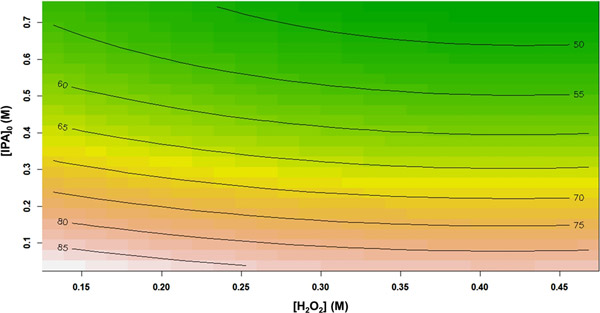 圖2顯示了總有機碳去除效率百分數(shù)與H 2 O 2濃度和初始異丙醇濃度的關(guān)系。從響應(yīng)輪廓中可以看出,將異丙醇初始濃度從0.038 M增加到0.743 M,導(dǎo)致TOC去除率從85.17%急劇降低到46.29%。可能是因為在相同的應(yīng)用反應(yīng)條件下,自由基(OH•)的數(shù)量保持恒定,而初始異丙醇濃度卻增加了。換句話說,相對較少量的氧化基團可用于攻擊異丙醇分子。類似地,總有機碳降解性能也隨著H 2 O 2濃度的增加而逐漸降低。過量的H 2 O 2可能促進自動清除反應(yīng)的發(fā)生。