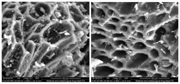 通常,由碳化過(guò)程形成的活性炭具有粗糙的表面結(jié)構(gòu),其孔徑不會(huì)太大以至于會(huì)影響吸附能力(圖1)。粒度和表面積對(duì)吸附劑很重要,因?yàn)榱6葧?huì)影響吸附能力。由該圖可知,通過(guò)RSS碳化處理得到的活性炭的孔徑為40μm左右,未改性,使用活化液進(jìn)行改性后,為<20μm。這表明,活化液的浸漬在孔的形成中起著重要的作用。促進(jìn)更多的孔隙形成?偙砻娣e影響總吸附容量,從而提高吸附劑去除廢水中有機(jī)化合物的效率。