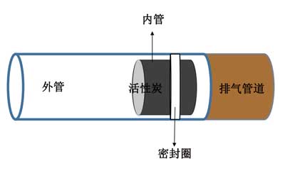 模擬的測試環(huán)境包含內(nèi)部和外部兩部分的試管進行吸附。外管的長度為50cm,直徑為3.8cm。該管的功能是將排氣消聲器連接至氣體分析儀,而內(nèi)管則用作活性炭的儲存器。改變內(nèi)管的長度,以確定活性炭負載百分比對降低廢氣濃度的影響。直徑分別為3cm,4cm和5cm。管子之間有一個密封,以防止廢氣泄漏。管的結(jié)構(gòu)在圖1中進行了描述。