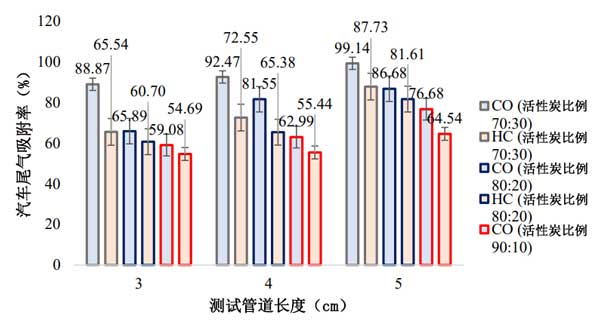 為了確定吸附管的長度對汽車尾氣中的CO和HC氣體排放吸附能力的影響。所用的活性炭是改性的。根據(jù)圖3所示的圖表,可以看出吸附管越長,CO和HC的吸附百分數(shù)越高。這是因為吸附面積更長。吸附區(qū)域是活性炭與廢氣之間發(fā)生接觸的區(qū)域。吸附面積越寬,活性炭吸附的污染物氣體量就越大。因此,CO和HC的濃度將由于接觸面積而降低。