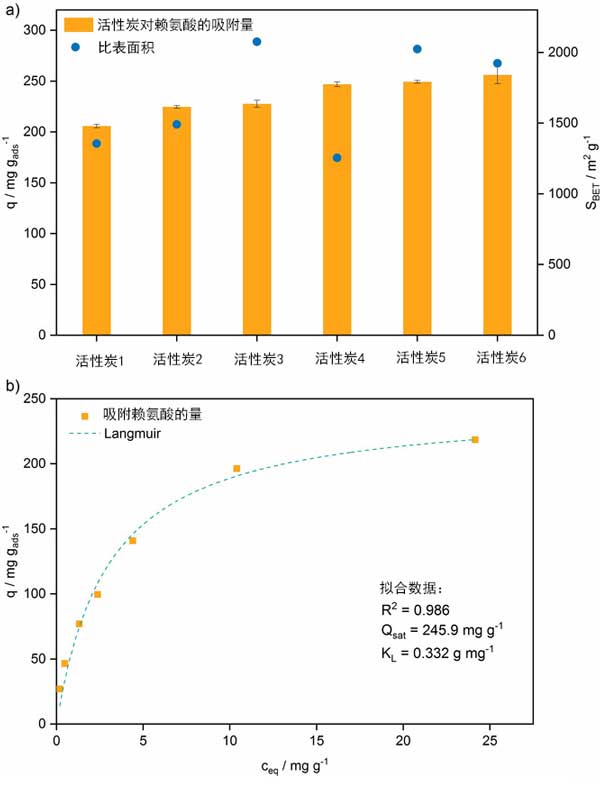 圖1:a、使用具有相應(yīng)表面積的市售活性炭吸附的賴(lài)氨酸量。誤差線(xiàn)對(duì)應(yīng)于從三次重復(fù)實(shí)驗(yàn)確定的標(biāo)準(zhǔn)偏差。b、賴(lài)氨酸在Langmuir吸附等溫線(xiàn)模型上的吸附等溫線(xiàn)。