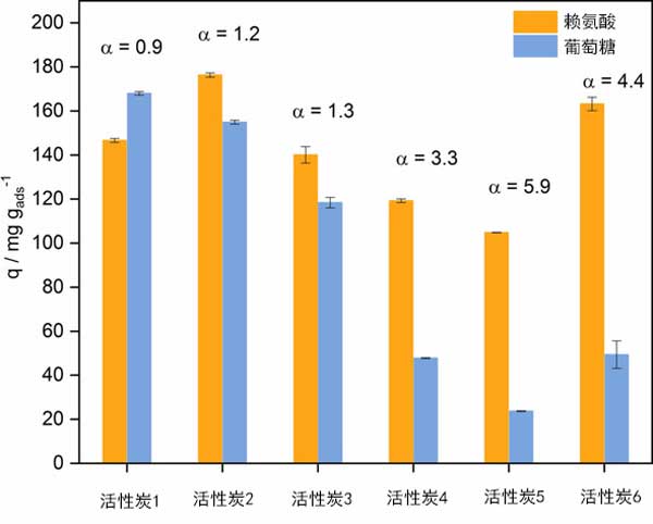 圖2:使用活性炭的競(jìng)爭(zhēng)性吸附實(shí)驗(yàn)中,賴(lài)氨酸和葡萄糖的吸附量。