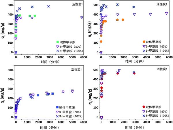 圖3:活性炭在25°C時(shí)映體,S-甲草胺(60%)和S-甲草胺(100%)吸附的演變。