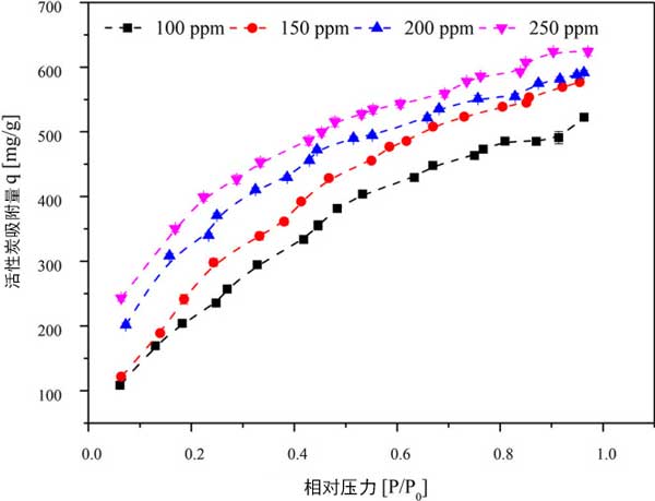 為了確定三氯乙烯初始濃度在進料流中的影響,研究了100、150、200和250ppm的濃度。維持其他實驗條件,活性炭顆粒大小為355μm,床溫為30°C,活性炭重量為50mg。入口濃度為100、150、200和250ppm時的吸附容量分別為523.252、575.844、593.181和624.044mg/g。隨著入口三氯乙烯濃度的增加,在壓力增加的情況下,活性炭的吸附容量顯示出穩(wěn)定的增加。在較高濃度下,隨著壓力的增加,吸附容量的增加可能是由于相鄰分子與微孔中的層內(nèi)分子粘附所致。這導致形成粘附在吸附劑表面上的層內(nèi)分子的相鄰三氯乙烯分子堆疊。三氯乙烯分子的平面形狀的動力學直徑為6.6。因此,它會積聚在活性炭的微孔/中孔上。在活性炭的微孔區(qū)域中具有大孔體積的情況下,假設(shè)縫隙形狀的孔幾何形狀,則期望對活性炭上的三氯乙烯具有高親和力。在低濃度(0-8000μg/L)的活性炭上進行了三氯乙烯的吸附,在室溫下吸附量為160mg/g。