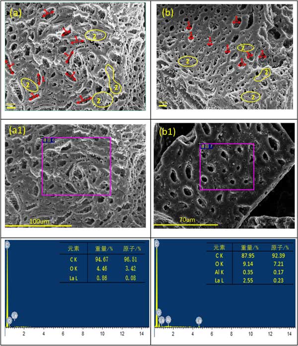 通過掃描電子顯微鏡(SEM)來顯示樣品的微觀形態(tài)和相應(yīng)的能量色散光譜(EDS)圖像,以證明鑭或鋁在兩種金屬上的成功加載的活性炭,在合適條件下制備。鑭改性活性炭和鑭鋁改性活性炭的SEM圖像如圖2所示。在圖2a中,有許多橢圓形孔標記為1。鑭改性活性炭的表面較粗糙,而較細的多孔結(jié)構(gòu)則標記為2。但是,鑭鋁改性活性炭的孔結(jié)構(gòu)在圖3b中進行了更改。標記為1的孔結(jié)構(gòu)變得更規(guī)則圓,標記為2的細孔尺寸變大,并且孔分布更均勻,這適合更好的吸附能力。從圖2a1,a2和b1,b2中的樣品中檢測到元素鑭和鋁的存在。鑭的重量百分比為0.86%,經(jīng)過鑭(NO3)3·2H2O和率(NO3)3的改性后,明顯增加至2.55%。更多鑭的含量將顯示出更好的吸附性能,這可能是由于兩種元素在改性過程中的協(xié)同作用所致。