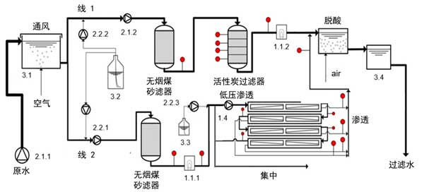 半技術(shù)試驗工廠安裝了電氣安裝,工廠控制和數(shù)據(jù)管理。中試工廠由兩條處理線活性炭和反滲透膜(參見圖1)組成,具有17個采樣點。充氣后的原水通過增壓泵2.1.1和2.1.2從儲水箱(3.1)連續(xù)泵出。將痕量有機污染物(3.2)注入標有2.2.1和2.2.2的泵的吸入側(cè),以確保適當?shù)臎_洗混合和良好的分散性。加水后的水以平行模式通過無煙煤砂濾池以及隨后的活性炭(線1)和反滲透膜(線2)。每月對粒子過濾器進行反沖洗。為了測試紫外線消毒在反滲透膜之前作為減少生物結(jié)垢的附加預(yù)處理步驟的效果,在活性炭砂濾池的下游操作了紫外線裝置(1.1.1)。反滲透膜管線的進料通過兩個濾筒過濾器進行預(yù)處理,兩個濾筒過濾器依次安裝了80和5μm的標稱截止值。
