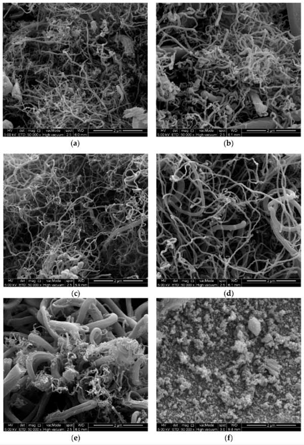 用FESEM技術分析了合成樣品的形態(tài)特征。圖2a-f顯示了放大的50,000倍的六個選定活性炭樣品圖像。圖2c顯示了活性炭5的FESM圖像,通過使用5%的鐵作為單催化劑和40分鐘的反應時間,發(fā)現(xiàn)炭產率和接觸角較高。在此樣本中發(fā)現(xiàn)了兩種類型的碳納米材料,分別是碳納米纖維和多壁碳納米管。圖2f顯示了活性炭3的FESEM圖像,該圖像是通過使用4%的鈷作為單催化劑和40分鐘的反應時間制備的。發(fā)現(xiàn)僅使用大量的鈷作為催化劑產生非常差的炭產率,這表明材料制備得不怎么好。圖2e顯示了活性炭4的FESEM圖像,該圖像是通過使用5%的鐵和4%的鈷作為雙金屬催化劑制備的,反應時間為40分鐘。該圖像表明,使用大量的鈷和鐵時,主要生成聚集的炭納米材料和碳納米纖維,因為這樣的實驗條件不是優(yōu)選的。