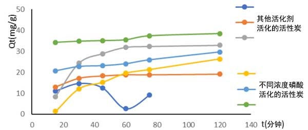 活性炭的吸附時(shí)間影響可從圖1看出,活性炭吸附分三步進(jìn)行:第一是在最初的30分鐘內(nèi),污染物的吸附量很快就被確定了,這可以用在吸附劑的外表面存在大量空置的結(jié)合位點(diǎn),這使得吸附劑易于吸附到該表面。第二在31分鐘后,吸附速率降低,過程緩慢;钚蕴康钠渌恢眠_(dá)到飽和后,污染物顆粒將遷移到吸附劑內(nèi)部。由于易于接近,因此吸附過程緩慢:顆粒內(nèi)擴(kuò)散。第三從80分鐘開始,我們觀察到一次接觸,活性炭已達(dá)到其最大容量。我們可以說這些吸附劑的平衡時(shí)間是80分鐘。然而,磷酸活化的活性炭吸附量的演化曲線顯示,在最初的30分鐘內(nèi),污染物的吸附量顯著增加,此后,污染物的吸附量急劇下降,這將是一種產(chǎn)物解吸。這一現(xiàn)象在其他吸附劑中是不可見的,這可能意味著可用孔隙的數(shù)量和結(jié)合力隨著所用活化劑濃度的增加而增加,這一點(diǎn)還通過碘值和亞甲基藍(lán)的值進(jìn)行了驗(yàn)證。