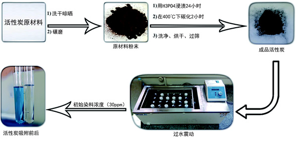 為了對(duì)廢水中的亮綠色染料進(jìn)行去除。我們進(jìn)行了間歇吸附過程,以研究實(shí)驗(yàn)參數(shù)對(duì)活性炭吸附亮綠色染料的影響,可以總結(jié)為圖1。首先,將活性炭與50mL不同濃度(10–50ppm)的亮綠色染料溶液在中性pH值下于125mL玻璃瓶中以固定溫度(25±2°C)和恒定搖動(dòng)速度。在震蕩的水浴中間隔不同的時(shí)間,直到在達(dá)到平衡。其次,使用電動(dòng)離心機(jī)將溶液離心分離,并通過分光光度計(jì)測(cè)定濾液的濃度。