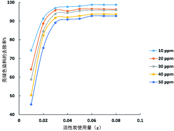 圖3:活性炭使用量對(duì)亮綠色染料吸附在活性炭上的影響。