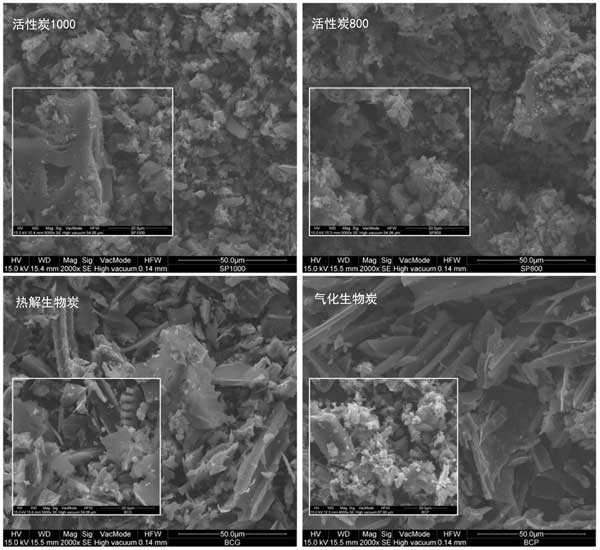 圖2:研究的1000碘值活性炭,800碘值活性炭,熱解生物炭和氣化生物炭樣品的SEM圖像。子圖是較高放大倍數(shù)的SEM圖像。