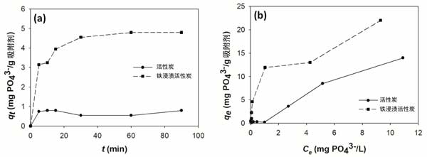 圖3:(a)磷酸鹽在活性炭和浸漬活性炭上的吸附動(dòng)力學(xué),以及(b)對(duì)磷酸鹽的吸附等溫線(xiàn)。