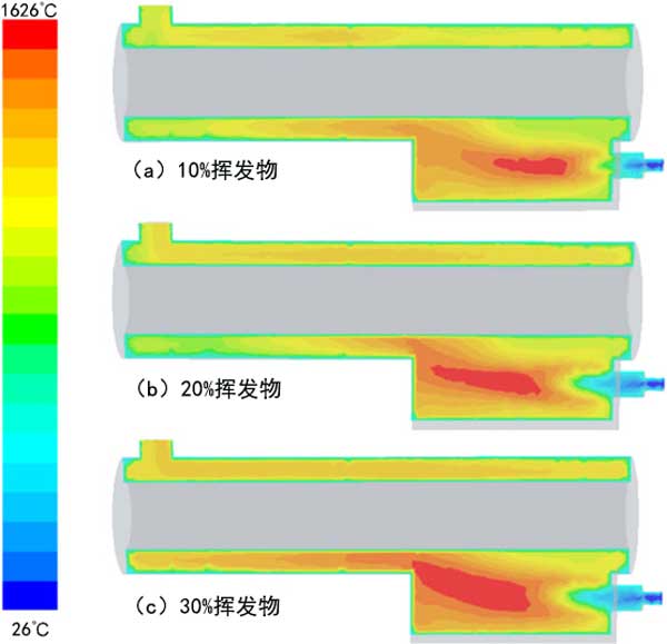 為了優(yōu)化反應(yīng)器的運(yùn)行,使用流體力學(xué)建模來模擬揮發(fā)物的燃燒。該模型包括焦油的轉(zhuǎn)化以及活性炭和灰份的形成。模擬并比較了三種工作條件截面中的溫度分布特性顯示在圖3顯示。